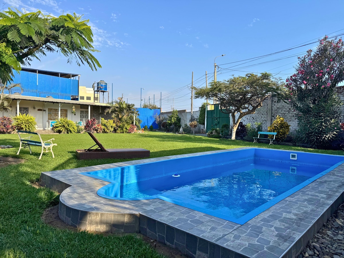 ಪ್ರಶಾಂತ ಪ್ರದೇಶದಲ್ಲಿ ವಿಶಾಲವಾದ ಮತ್ತು ಆರಾಮದಾಯಕ ಸ್ಥಳಗಳನ್ನು ಹೊಂದಿರುವ ಮತ್ತು ಪ್ರಕೃತಿಯಿಂದ ಆವೃತವಾದ ಸುಂದರವಾದ ಪ್ರೈವೇಟ್ ಕಂಟ್ರಿ ಹೌಸ್. ನಾವು ಸಾಕುಪ್ರಾಣಿ ಸ್ನೇಹಿಯಾಗಿದ್ದೇವೆ ಮತ್ತು ಉಚಿತ ಪಾರ್ಕಿಂಗ್ ಹೊಂದಿದ್ದೇವೆ. ಸ್ಥಳ - ನಾವು ಚಾನ್ ಚಾನ್ಗೆ ಹತ್ತಿರದಲ್ಲಿದ್ದೇವೆ, ಇಲ್ಲಿ: - ಹುವಾಂಚಾಕೊ ಸ್ಪಾದಿಂದ 7 ಕಿ .ಮೀ (10 ನಿಮಿಷ ಡ್ರೈವ್) - ಕಾರ್ಲೋಸ್ ಮಾರ್ಟಿನೆಜ್ ಡಿ ಪಿನಿಲ್ಲೋಸ್ ವಿಮಾನ ನಿಲ್ದಾಣದಿಂದ 4 ಕಿ .ಮೀ (ಕಾರಿನಲ್ಲಿ 7 ನಿಮಿಷಗಳು). - ಟ್ರುಜಿಲ್ಲೊ ನಗರ ಕೇಂದ್ರದಿಂದ 6 ಕಿ .ಮೀ (9 ನಿಮಿಷದ ಡ್ರೈವ್). ಮನೆ ಗೆಸ್ಟ್ಗಳಿಗಾಗಿ ಮಾತ್ರ ಮತ್ತು ಇತರ ವ್ಯಕ್ತಿಗಳೊಂದಿಗೆ ಹಂಚಿಕೊಂಡಿಲ್ಲ.