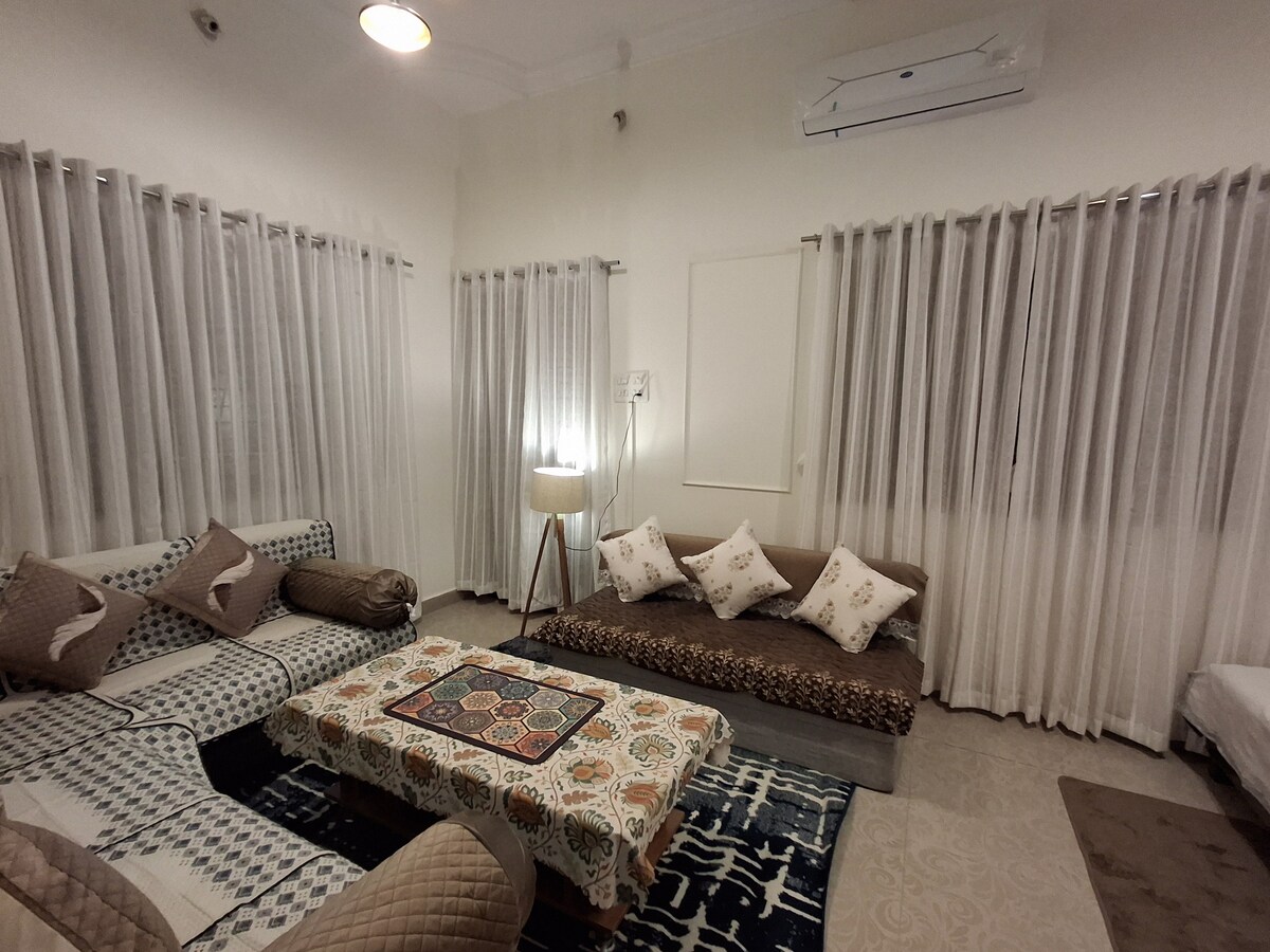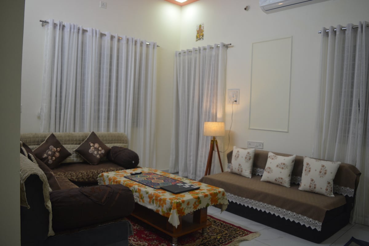 ಉಜ್ಜಯಿನಿಯಲ್ಲಿರುವ ನಮ್ಮ ವಿಶಾಲವಾದ 2BHK ರಿಟ್ರೀಟ್ಗೆ ಸುಸ್ವಾಗತ — ಮಹಾಕಲ್ ದೇವಸ್ಥಾನಕ್ಕೆ ಭೇಟಿ ನೀಡುವ ಕುಟುಂಬಗಳು ಮತ್ತು ಗುಂಪುಗಳಿಗೆ ಸೂಕ್ತವಾಗಿದೆ. ಈ ಮನೆಯಲ್ಲಿ AC ಮಲಗುವ ಕೋಣೆಗಳು, ಖಾಸಗಿ ಬಾಲ್ಕನಿ, ಮೂಲಭೂತ ಅಡುಗೆಮನೆ ವ್ಯವಸ್ಥೆ (ಚಹಾ/ಕಾಫಿಗಾಗಿ), RO ನೀರು ಮತ್ತು ಉಚಿತ ಪಾರ್ಕಿಂಗ್ ಸೌಲಭ್ಯಗಳಿವೆ. ವಿನಂತಿಯ ಮೇರೆಗೆ 9 ಜನರಿಗೆ ಹೆಚ್ಚುವರಿ ಬೆಡ್ಡಿಂಗ್ನೊಂದಿಗೆ 7 ಜನ ಅತಿಥಿಗಳು ಆರಾಮವಾಗಿ ವಾಸ್ತವ್ಯ ಹೂಡಬಹುದು. ತುಂಬಾ ಸುಂದರವಾದ ಟೆರೇಸ್ ಗಾರ್ಡನ್. ಹೊಂದಿಕೊಳ್ಳುವ ಚೆಕ್-ಇನ್, ಶಾಂತಿಯುತ ನೆರೆಹೊರೆ ಮತ್ತು ದೇವಾಲಯದ ಭೇಟಿಗಳಿಗಾಗಿ ಹೋಸ್ಟ್ ಮಾರ್ಗದರ್ಶನವನ್ನು ಆನಂದಿಸಿ. ಸ್ವಚ್ಛ, ಆರಾಮದಾಯಕ ಮತ್ತು ಚಿಂತನಶೀಲವಾಗಿ ಸಿದ್ಧವಾಗಿದೆ — ಉಜ್ಜಯಿನ ಮನೆಯಿಂದ ದೂರದಲ್ಲಿರುವ ನಿಮ್ಮ ಮನೆ.