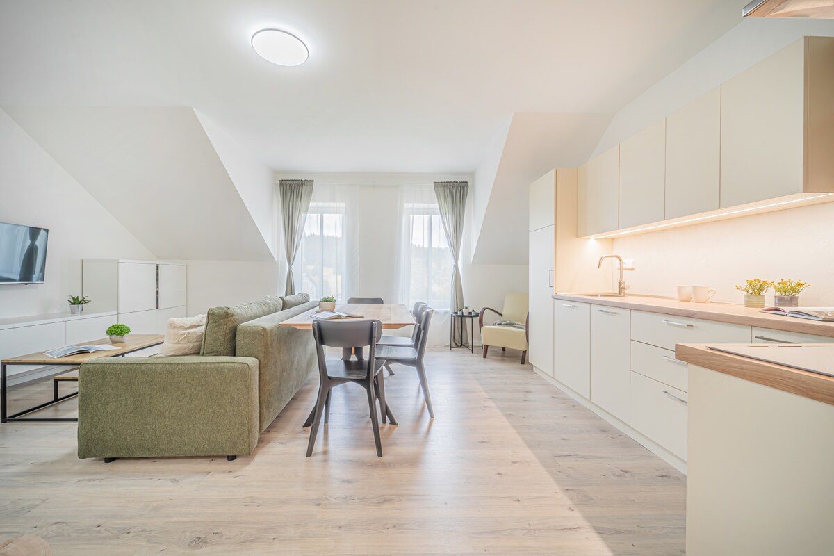 ಸ್ನೇಹಶೀಲ, ಸೊಗಸಾಗಿ ಸುಸಜ್ಜಿತವಾದ 2+kk ಅಪಾರ್ಟ್ಮೆಂಟ್ ಸೌನಾದೊಂದಿಗೆ, ಓರೆ ಪರ್ವತಗಳ ಸುಂದರವಾದ ಸುತ್ತಮುತ್ತಲಿನ ಪ್ರದೇಶದಲ್ಲಿ, ಕ್ಲಿನೋವ್ಸ್ನಿಂದ ಕೇವಲ 10 ಕಿ.ಮೀ ದೂರದಲ್ಲಿರುವ Černý potok ಗ್ರಾಮದಲ್ಲಿದೆ. ಅಪಾರ್ಟ್ಮೆಂಟ್ ನೀಡುತ್ತದೆ: ಸೋಫಾ ಬೆಡ್ ಮತ್ತು ಕಿಚನೆಟ್ನೊಂದಿಗೆ ಲಿವಿಂಗ್ ರೂಮ್. ಡಬಲ್ ಬೆಡ್ ಹೊಂದಿರುವ ಬೆಡ್ರೂಮ್. ಪೂರ್ಣ ಬಾತ್ರೂಮ್. ಕಟ್ಟಡದ ನೆಲ ಮಹಡಿಯಲ್ಲಿ ನೀವು ವಿಶ್ರಾಂತಿ ಕೋಣೆಯೊಂದಿಗೆ ಸೌನಾವನ್ನು ಬಳಸಬಹುದು. ಸೌನಾ ಶುಲ್ಕಕ್ಕಾಗಿ ಇದೆ. ಅಪಾರ್ಟ್ಮೆಂಟ್ ಅರಣ್ಯದ ಬಳಿ ಶಾಂತ ಸ್ಥಳದಲ್ಲಿದೆ, ಅಲ್ಲಿ ನೀವು ಪ್ರಕೃತಿಯ ಸೌಂದರ್ಯ ಮತ್ತು ಪರಿಪೂರ್ಣ ಶಾಂತಿಯನ್ನು ಆನಂದಿಸಬಹುದು. ಅಪಾರ್ಟ್ಮೆಂಟ್ ಸಣ್ಣ ಆಸನ ಪ್ರದೇಶವನ್ನು ಹೊಂದಿರುವ ಟೆರೇಸ್ ಅನ್ನು ಹೊಂದಿದೆ.