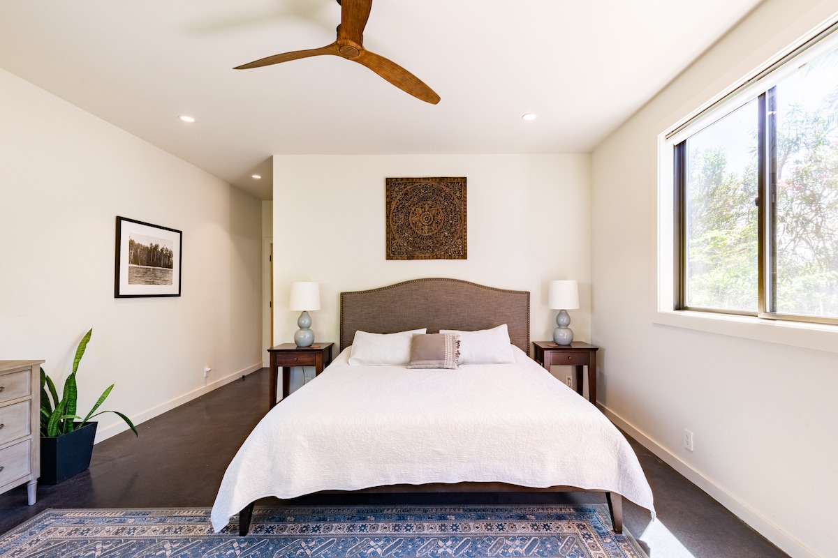 Beautiful, peaceful, jungle vibes, surrounded by nature, 15 min from the center of Kona, up on the mountainside, lush lot w/ fruit and mac nut trees! The ADULTS-ONLY space has an open floorplan, with high ceilings and lots of room. Luxury memory foam King bed, two front lanais, nice Weber grill, big Samsung TV with cable, Wifi, shared washer and dryer, and a great kitchen with all the amenities. Also: beach towels, chairs, cooler, & umbrella! This Private space is the largest unit of the home.