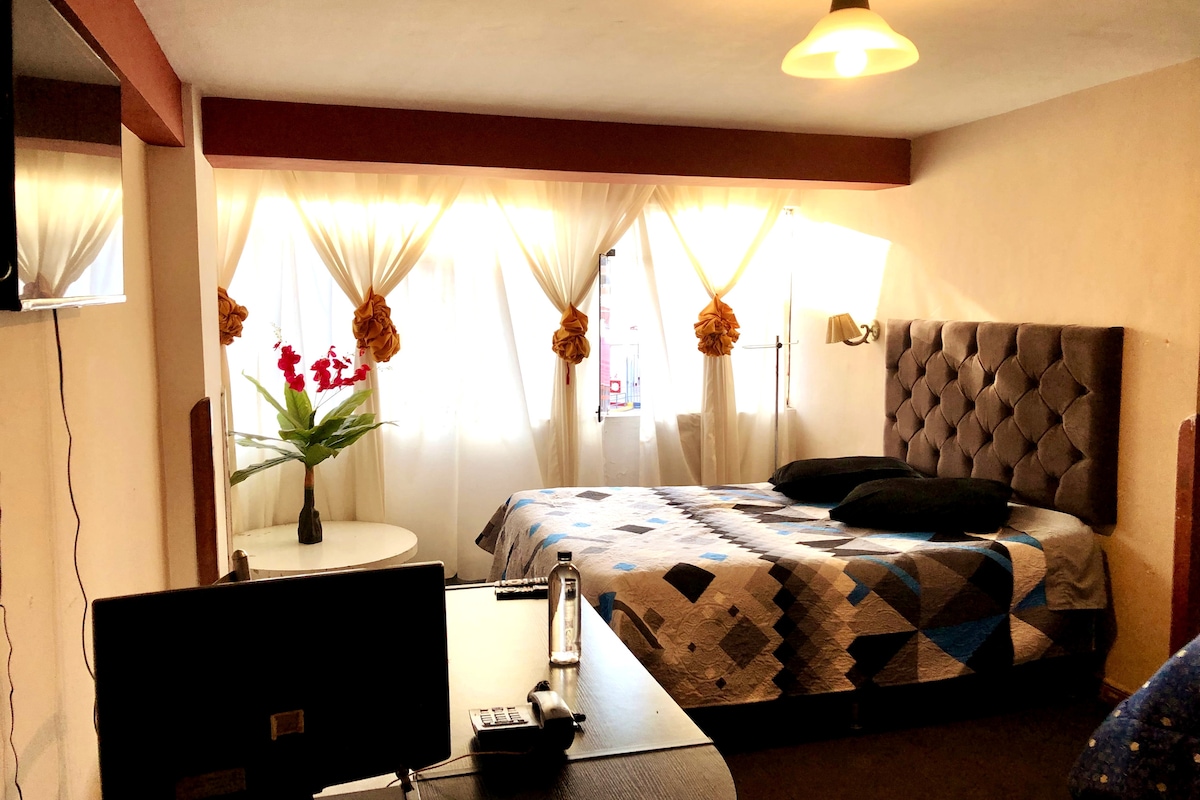 Agradable miniapartamento ubicado en cuarto piso, cuenta con baño privado, cocina, sala, escritorio, una pequeña terraza compartida y una lavandería de uso común; también cuenta con Wifi y TV y con abundante luz natural,la zona es centrica, segura y de fácil acceso, se puede llegar a la plaza de armas en 10 minutos usando taxi o en 30 minutos caminando. Cerca hay restaurantes, bancos, minimarket, farmacias, hospital y paradero de buses.