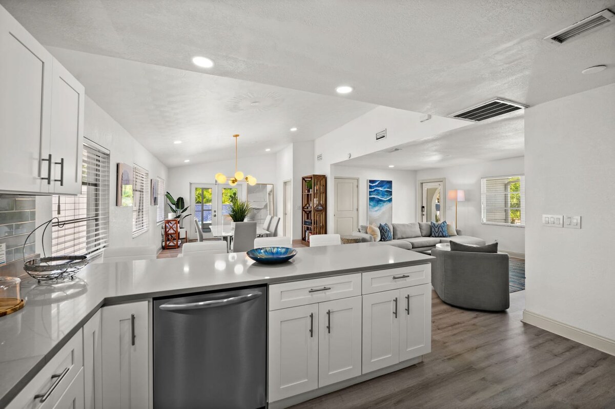 ನಮ್ಮ ಸಂತೋಷದ ಸ್ಥಳಕ್ಕೆ ಸುಸ್ವಾಗತ! ಈ ಸಂಪೂರ್ಣವಾಗಿ ನವೀಕರಿಸಿದ ನೇಪಲ್ಸ್ ರಿಟ್ರೀಟ್ 6 ಜನರು ವಾಸಿಸಬಹುದು ಮತ್ತು ಕುಟುಂಬದ ವಿನೋದದೊಂದಿಗೆ ಆಧುನಿಕ ಸೌಕರ್ಯವನ್ನು ಸಂಯೋಜಿಸುತ್ತದೆ. ಪ್ರಕಾಶಮಾನವಾದ ತೆರೆದ-ಯೋಜನೆಯ ಲಿವಿಂಗ್ ಪ್ರದೇಶ, ಬಾಣಸಿಗರ ಅಡುಗೆಮನೆ ಮತ್ತು ಪೂಲ್ ಪ್ರವೇಶವನ್ನು ಹೊಂದಿರುವ ಮಾಸ್ಟರ್ ಸೇರಿದಂತೆ 3 ಮಲಗುವ ಕೋಣೆಗಳನ್ನು ಆನಂದಿಸಿ. ಬಿಸಿ ಮಾಡಿದ ಪೂಲ್, ಲೌಂಂಜ್ ಸೀಟಿಂಗ್, ಗ್ರಿಲ್, ಕಾಲುವೆ ಮತ್ತು ಗಾಲ್ಫ್ ಕೋರ್ಸ್ ವೀಕ್ಷಣೆಗಳೊಂದಿಗೆ ನಿಮ್ಮ ಖಾಸಗಿ ಸ್ಕ್ರೀನ್ಡ್ ಓಯಸಿಸ್ಗೆ ಹೊರಗೆ ಹೋಗಿ. ಗ್ಯಾರೇಜ್ ಗೇಮ್ ರೂಮ್ ಪಿಂಗ್-ಪಾಂಗ್ ಫೂಸ್ಬಾಲ್ ಮತ್ತು ಆರ್ಕೇಡ್ ಬ್ಯಾಸ್ಕೆಟ್ಬಾಲ್ ಅನ್ನು ನೀಡುತ್ತದೆ. ಕಡಲತೀರಗಳು, ಊಟ ಮತ್ತು ಡೌನ್ಟೌನ್ಗೆ ಕೆಲವೇ ನಿಮಿಷಗಳು, ಇದು ವಿಶ್ರಾಂತಿ ಮತ್ತು ಆಟಕ್ಕೆ ಸೂಕ್ತವಾದ ಸ್ಥಳವಾಗಿದೆ.