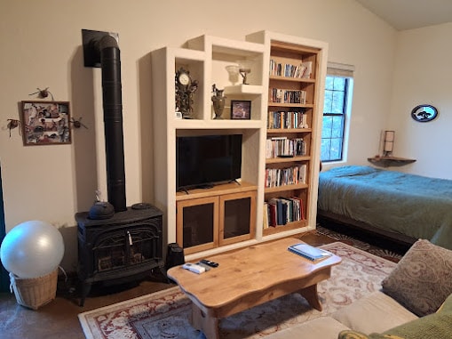 Spacious 972 sq ft over the garage guest apartment is all yours! Close to downtown Prescott headed northwest 7 miles (15 minutes) to a private gate. The gate opens and you’re in the National Forest where your retreat begins! Inside is a comfy cal-king bed, full kitchen and bath, laundry, two eating areas, two sitting areas, desk, pellet stove, mini-split heat and cool. You cannot book this apartment automatically. You must communicate direct with the owner. Non smoking, non-drinking guests.